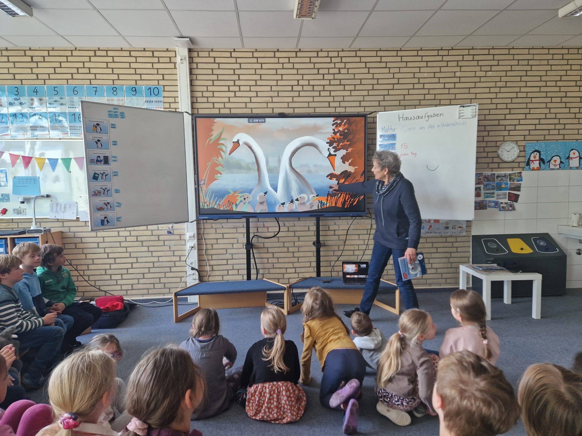 Die Klasse 1 der Grundschule Schmalenbeck lernen mit der Autorin Irene Margil mehr über das Stormarner Wappentier, der Schwan, kennen.