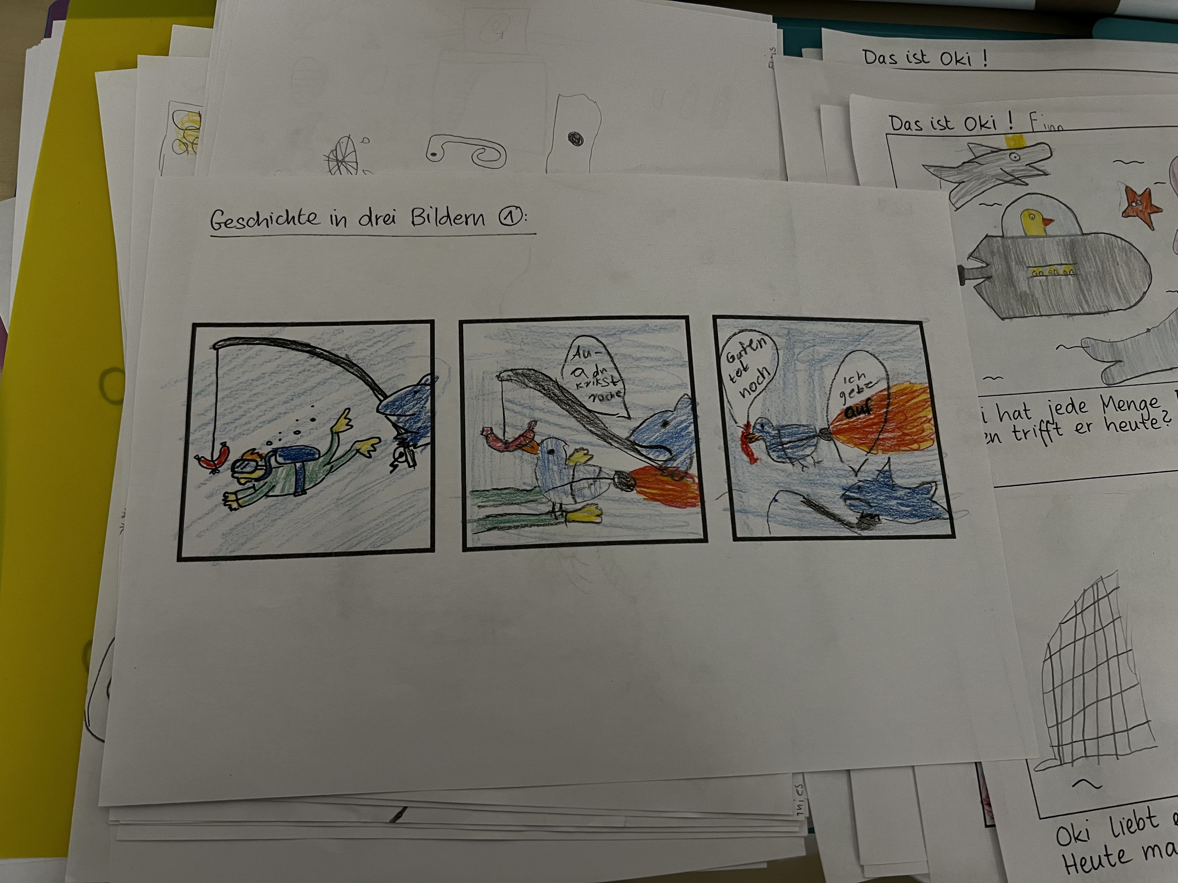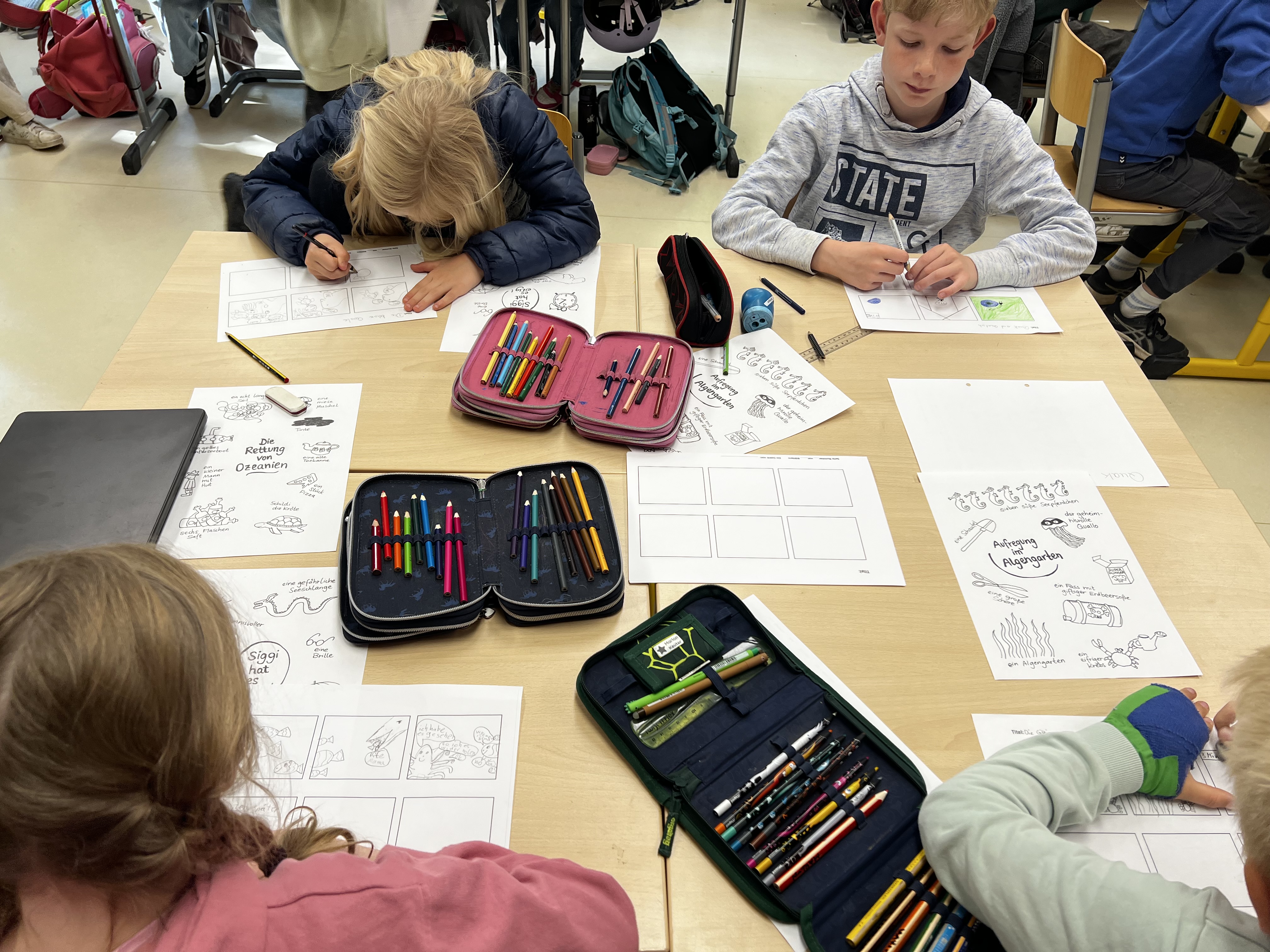 Nach der Lesung aus dem Buch "Was ist denn hier passiert?" tauchen die Kinder direkt in die Welt der Comics ein und erproben selbst erste einfache Zeichnungen und Bilderzählungen.